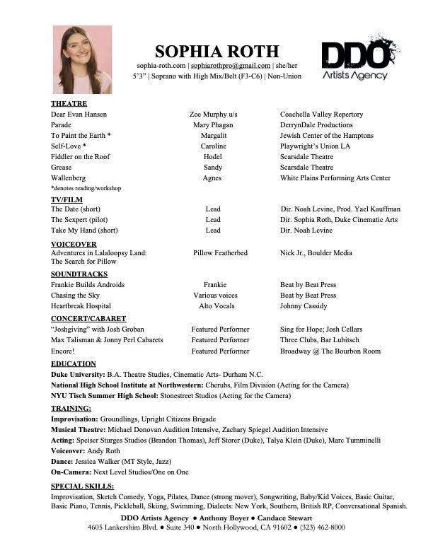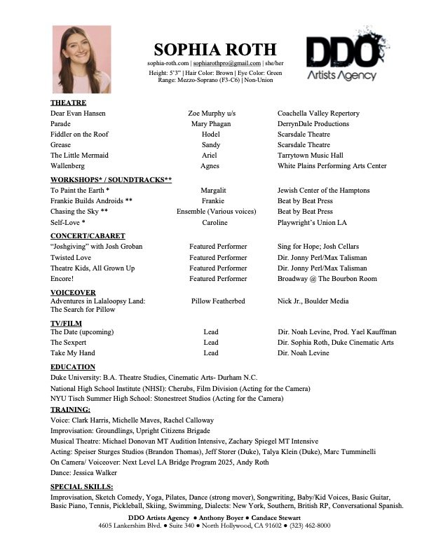 A graduate of Duke University with a B.A. in Theater Studies and Cinematic Arts, Sophia has built a multifaceted career spanning Theatre, Film/TV, voiceover, and music.